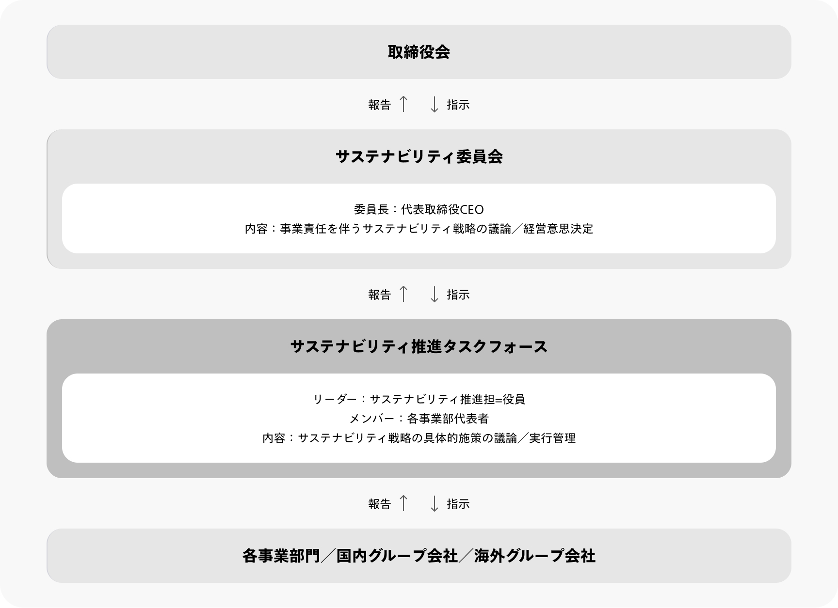 JINSでは、サステナビリティ活動を全社的に推進するために、サステナビリティ委員会を設置しています。この委員会は代表取締役CEOが委員長を務め、年に2回の開催を原則としています。委員会では、全社戦略の決定や2030年の目標設定、進捗のモニタリングを行い、サステナビリティ推進タスクフォースが提案した事項についても審議・決定します。 また、会議の中では外部アドバイザリーボードからの意見を取り入れ、客観的な視点を経営に反映させることを重視しています。これにより、サステナビリティに関する取り組みの透明性が高まり、より効果的な施策を実施することが可能となります。 重要事項については、取締役会に報告し、実効性のあるガバナンスを確立しています。これにより、全社的なサステナビリティの推進が強化され、持続可能な社会の実現に向けた取り組みが進んでいます。 私たちは、サステナビリティへの取り組みを通じて、社会的責任を果たし、未来の世代に対しても配慮した経営を行っています。これからも、持続可能な成長を目指し、さまざまな活動を展開していきます。 私たちのサステナビリティ活動に関する詳細については、ぜひご覧ください。